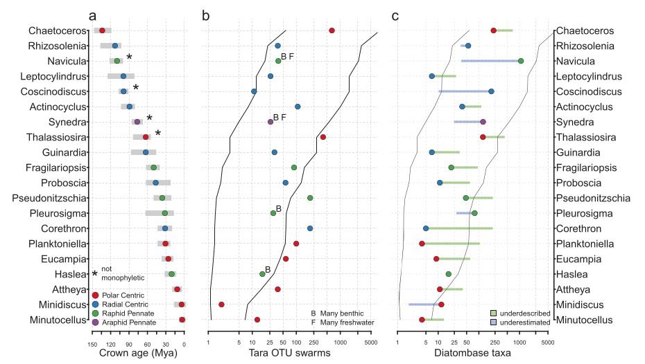 We investigate the evolutionary history of diatoms by applying phylogenetic comparative methods to large-scale molecular phylogenies. Our research explores how ecological traits, morphological innovations, and environmental changes have shaped diatom diversification over time. By linking macroevolutionary patterns with ecological processes, we seek to understand the drivers of lineage diversification and adaptation in one of the most species-rich groups of aquatic microorganisms.